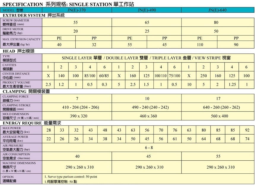 Thông số kĩ thuật máy thổi nhựa đài loan JN(E)370-JN(E)640