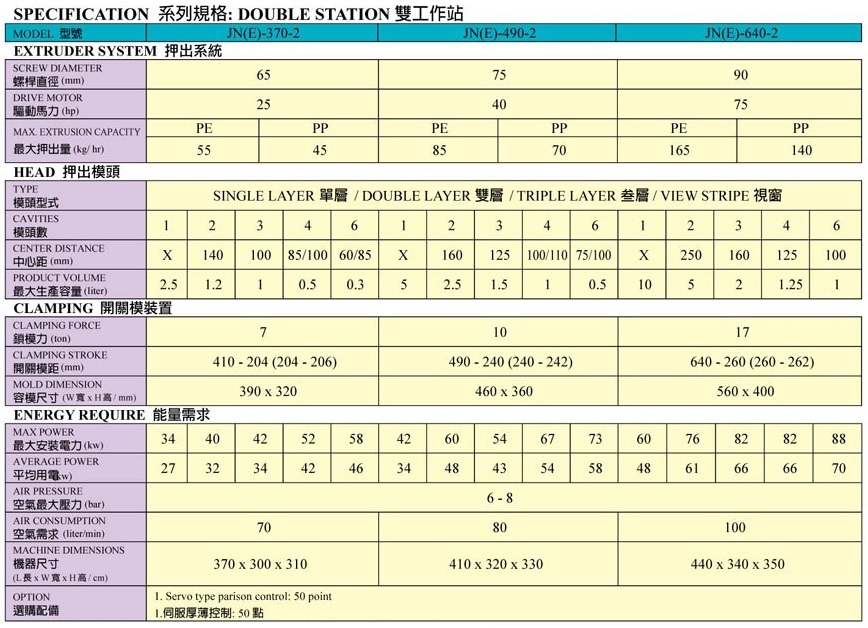Thông số kĩ thật máy thổi nhựa đài loan JN(E)370-JN(E)640 hai kìm