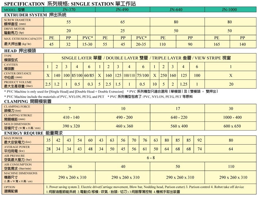 Thông số kĩ thuật máy thổi nhựa đài loan JN370-JN1000
